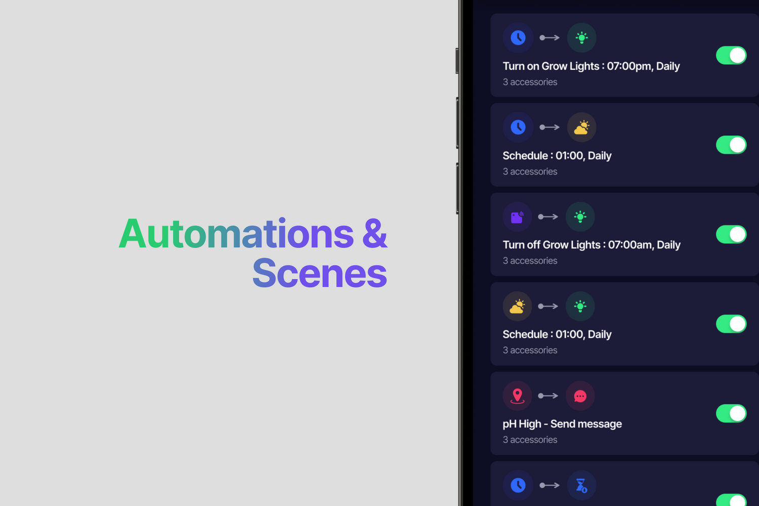With scenes, you can control multiple devices and sensors at the same time. Scenes is a powerful, easy to setup, that lets the grower build custom scenes and combine with automations for every type of grow