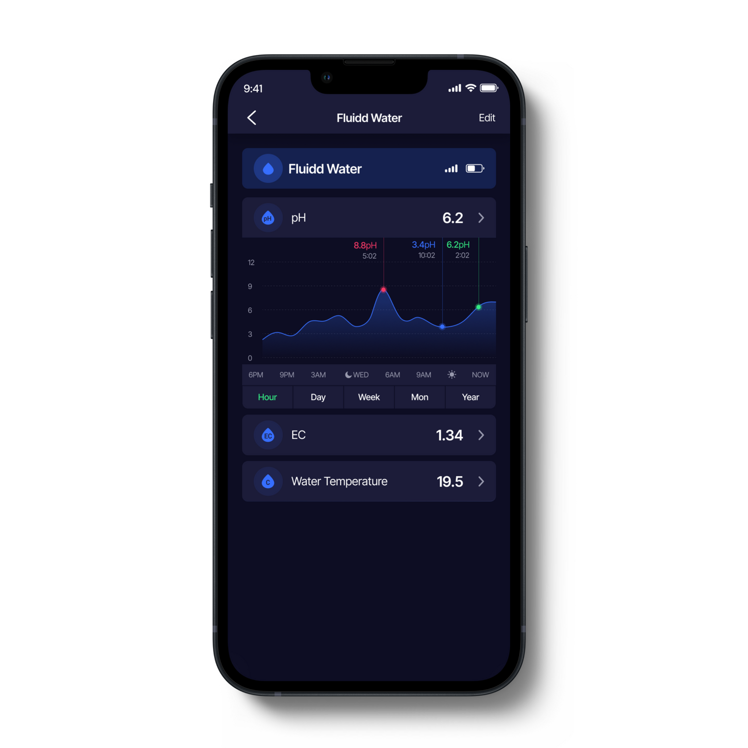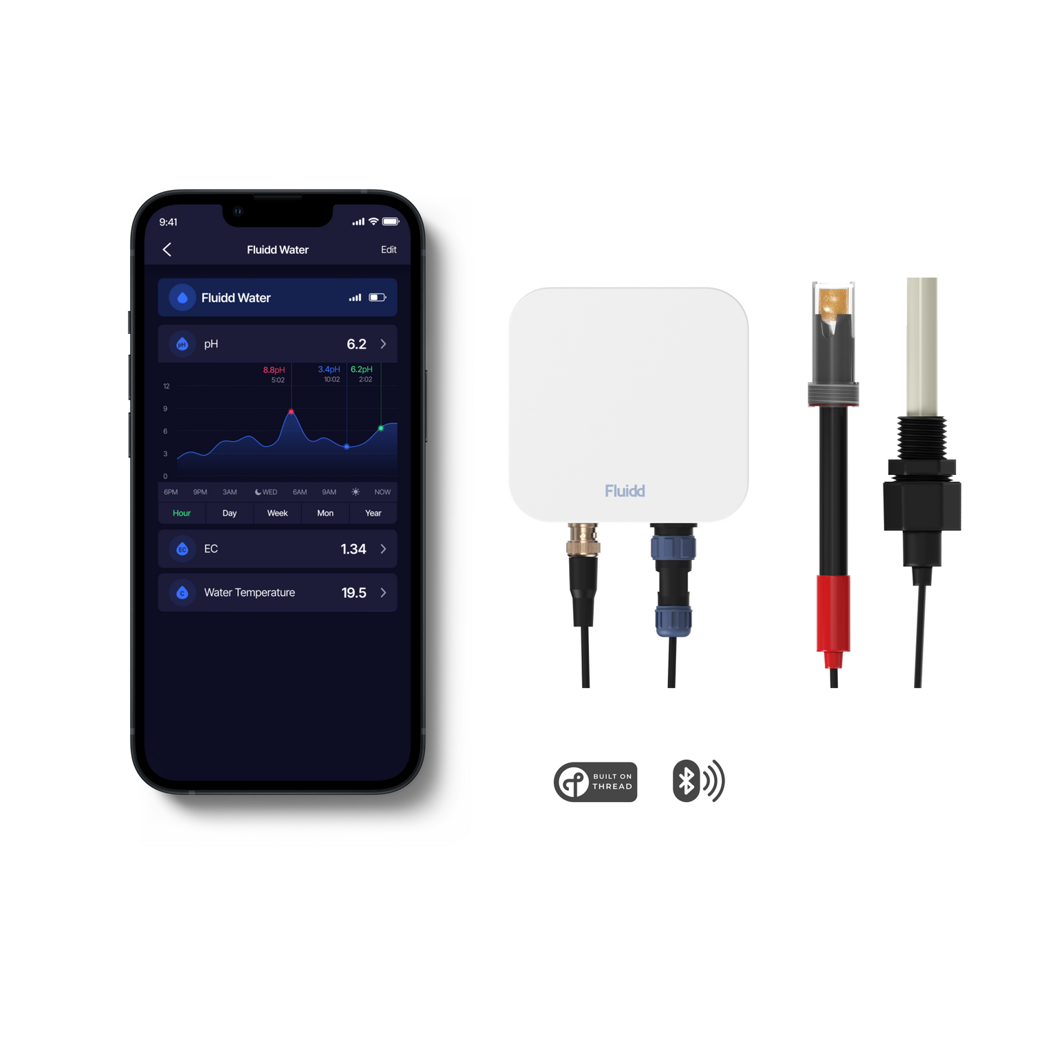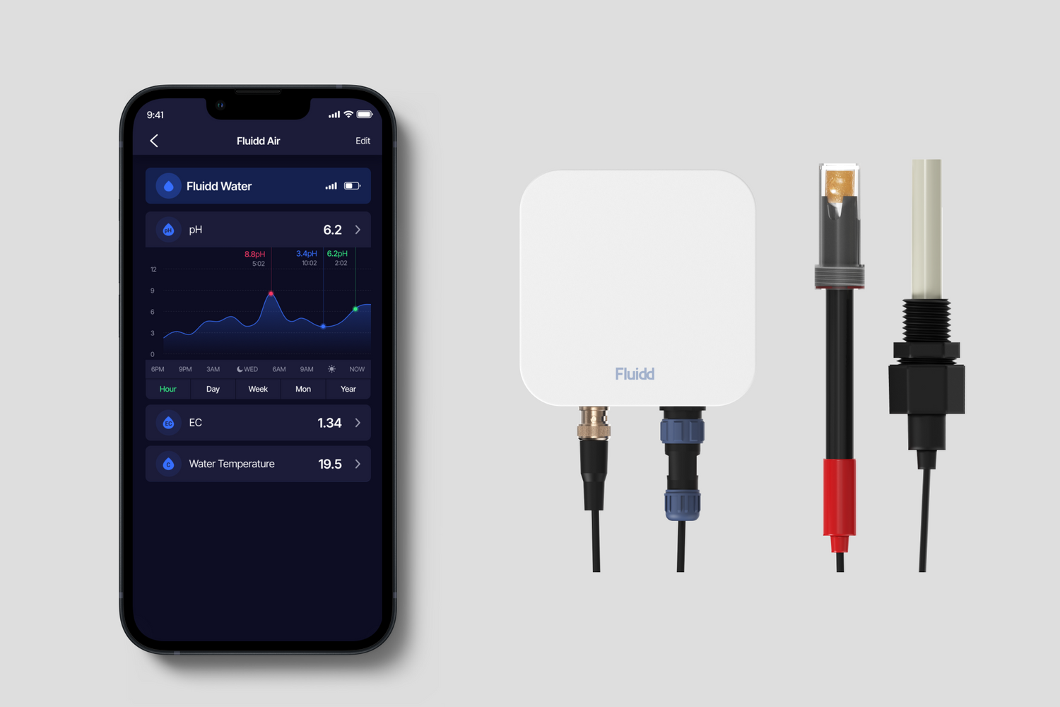 Water, the first-of-its-kind pH & EC device, revolutionizes the way growers manage their crops. Powered by ultra-fast and secure Thread technology and paired with the Fluidd app, Water gives you instant access to critical information and historical data, allowing you to optimize your yields like never before.